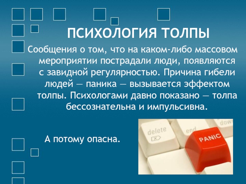 появляются с завидной регулярностью. Причина гибели людей — паника — вызывается эффектом толпы. Психологами давно показано — толпа бессознательна и импульсивна.