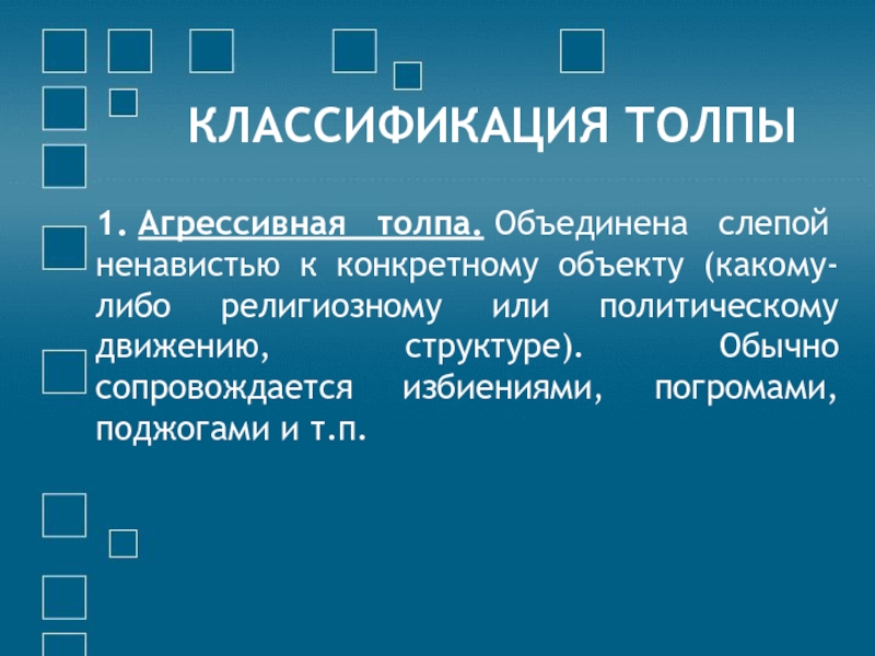 1. Агрессивная толпа. Объединена слепой ненавистью к конкретному объекту (какому-либо религиозному или
