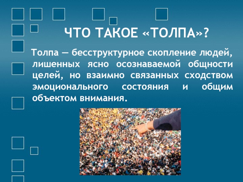Толпа — бесструктурное скопление людей, лишенных ясно
