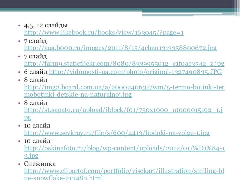 4,5, 12 слайды http://www.likebook.ru/books/view/163045/?page=17 слайд http://aaa.b000.ru/images/2011/8/15/4chan1313358800672.jpg7 слайд http://farm9.staticflickr.com/8080/8339955012_c1f0ae3542_z.jpg6 слайд http://vidomosti-ua.com/photo/original-1327490835.JPG8 слайд http://img2.board.com.ua/a/2000240637/wm/5-termo-botinki-termobotinki-detskie-na-naturalnoj.jpg 8 слайд http://st.sapato.ru/upload/iblock/f01/750x1000_ut000015192_1.jpg10 слайд http://www.sevkray.ru/file/s/600/4413/hodoki-na-volge-1.jpg