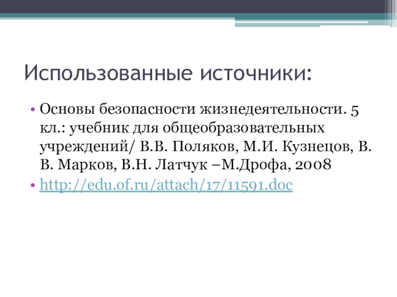 Использованные источники:Основы безопасности жизнедеятельности. 5 кл.: учебник для общеобразовательных учреждений/ В.В. Поляков, М.И. Кузнецов, В.В. Марков, В.Н.