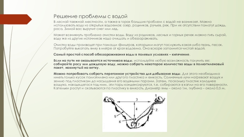 Если на пути не оказывается источников воды, используйте любую возможность получить ее: собирайте росу или дождевую воду, можно собрать некоторое количество воды в полиэтиленовый пакет, накинутый на ветку.