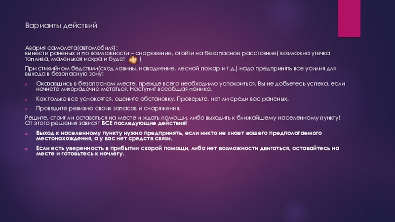 Решите, стоит ли оставаться на месте и ждать помощи, либо выходить к ближайшему населенному пункту! От этого решения зависят ВСЕ последующие действия!