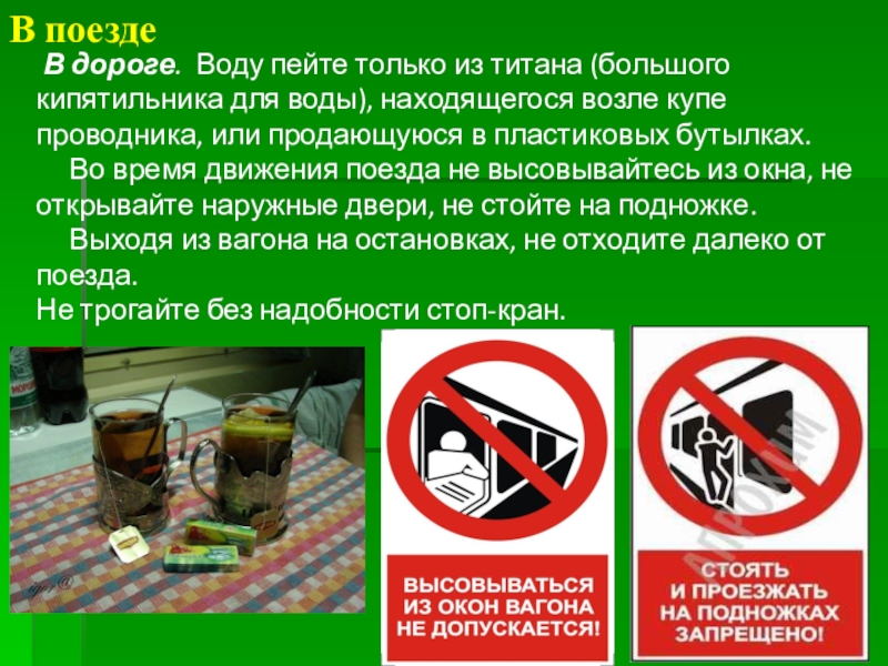 Во время движения поезда не высовывайтесь из окна, не открывайте наружные двери, не стойте на подножке.