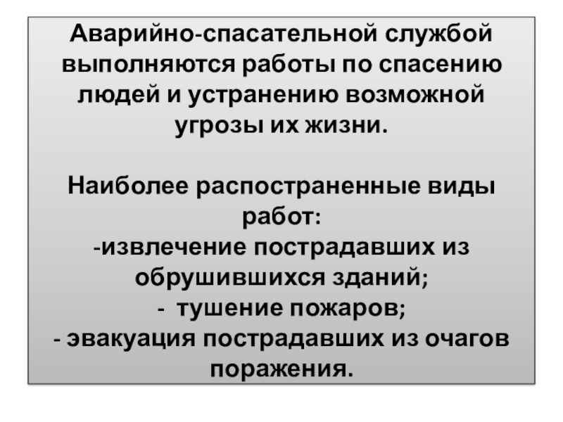 Аварийно-спасательной службой выполняются работы по спасению людей и устранению возможной угрозы их жизни.  Наиболее распостраненные виды