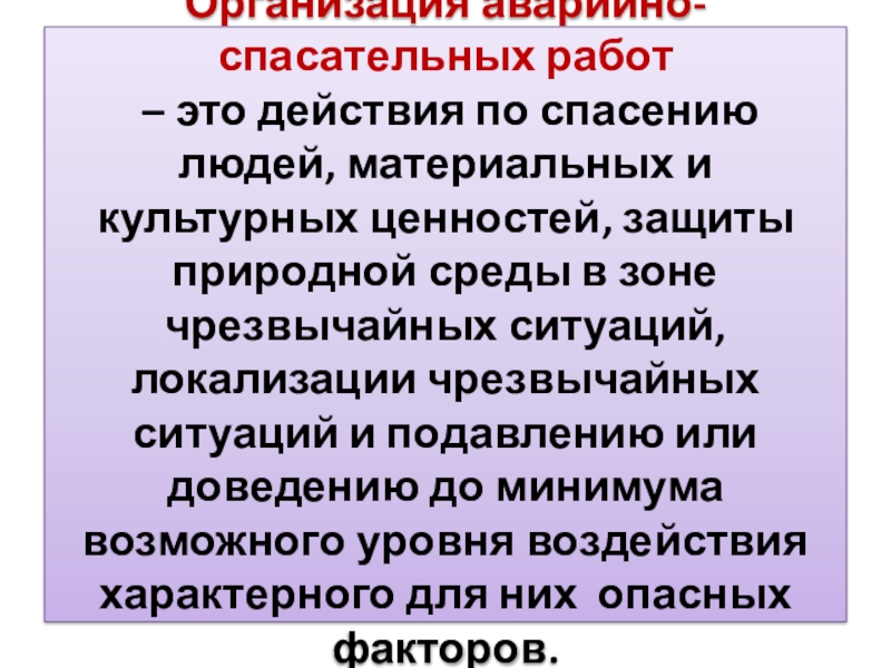 Организация аварийно-спасательных работ  – это действия по спасению людей, материальных и культурных ценностей, защиты природной среды