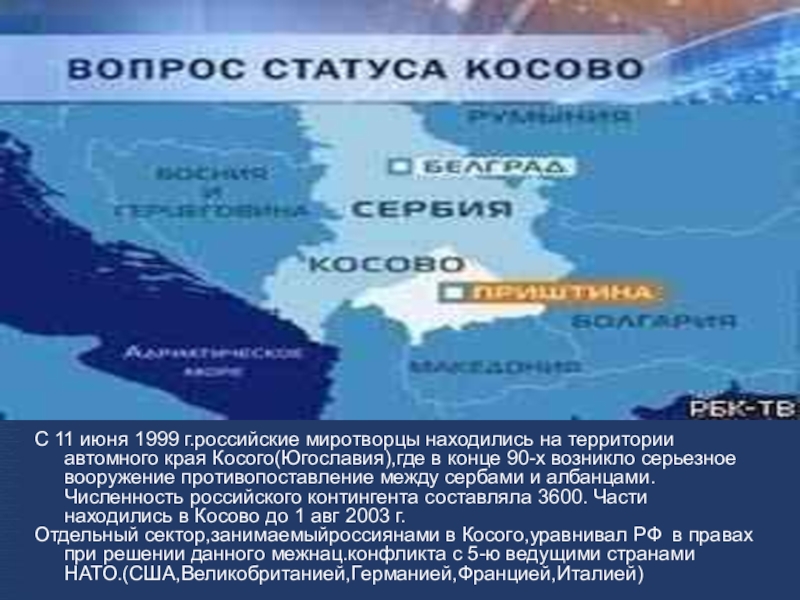 Косого(Югославия),где в конце 90-х возникло серьезное вооружение противопоставление между сербами и албанцами.Численность российского контингента составляла 3600. Части находились в Косово до 1 авг 2003 г.