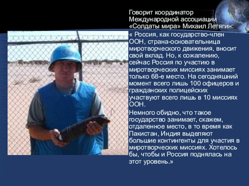 Слайд 15Говорит координатор Международной ассоциации «Солдаты мира» Михаил Летягин: