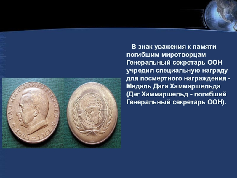 ООН учредил специальную награду для посмертного награждения - Медаль Дага Хаммаршельда (Даг Хаммаршельд - погибший Генеральный секретарь ООН).