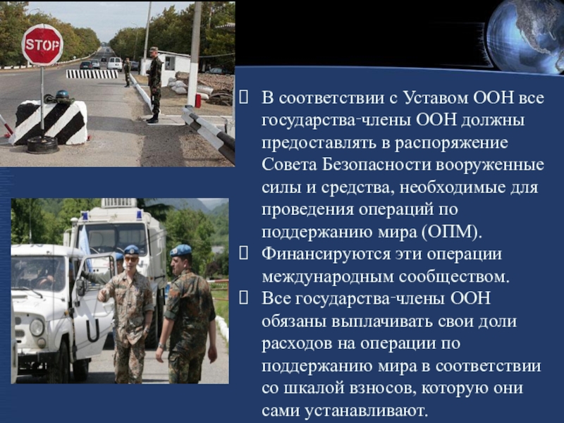 Все государства‑члены ООН обязаны выплачивать свои доли расходов на операции по поддержанию мира в соответствии со шкалой взносов, которую они сами устанавливают.