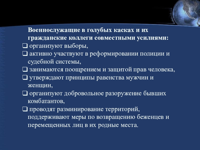 Слайд 9Военнослужащие в голубых касках и их гражданские коллеги совместными усилиями:
