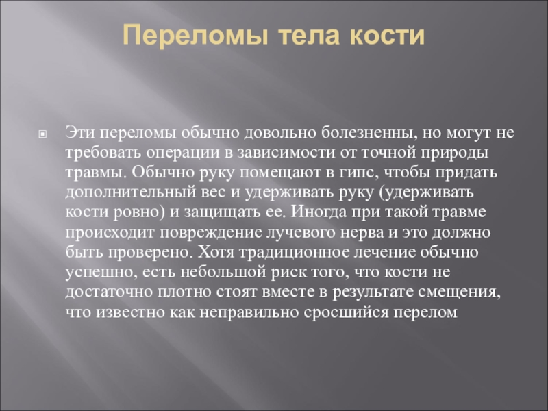 требовать операции в зависимости от точной природы травмы. Обычно руку помещают в гипс, чтобы придать дополнительный вес и удерживать руку (удерживать кости ровно) и защищать ее. Иногда при такой травме происходит повреждение лучевого нерва и это должно быть проверено. Хотя традиционное лечение обычно успешно, есть небольшой риск того, что кости не достаточно плотно стоят вместе в результате смещения, что известно как неправильно сросшийся перелом