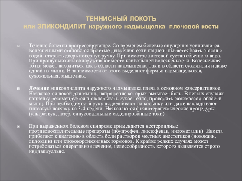 временем болевые ощущения усиливаются. Болезненными становятся простые движения: если пациент пытается взять стакан с водой. открыть дверь повернув ручку. При осмотре локтевой сустав обычного вида. При прощупывании обнаруживают место наибольшей болезненности. Болезненная точка может находиться как в области надмыщелка, так и в области сухожилия и даже одной из мышц. В зависимости от этого выделяют формы: надмыщелковая, сухожильная, мышечная.