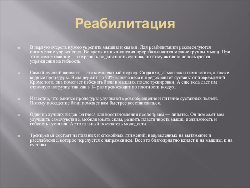 В первую очередь нужно укрепить мышцы и связки. Для реабилитации рекомендуются