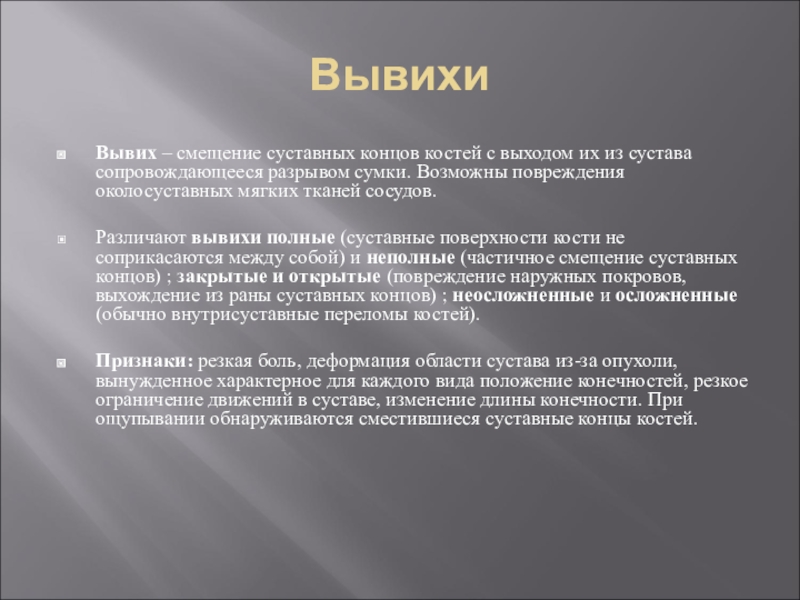 Различают вывихи полные (суставные поверхности кости не соприкасаются между собой) и неполные (частичное смещение суставных концов) ; закрытые и открытые (повреждение наружных покровов, выхождение из раны суставных концов) ; неосложненные и осложненные (обычно внутрисуставные переломы костей).