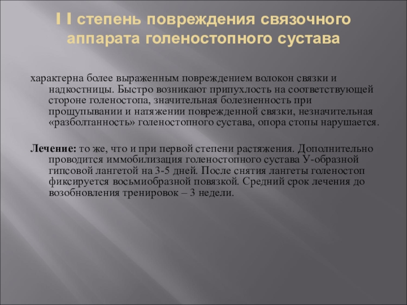 Слайд 24I I степень повреждения связочного аппарата голеностопного сустава