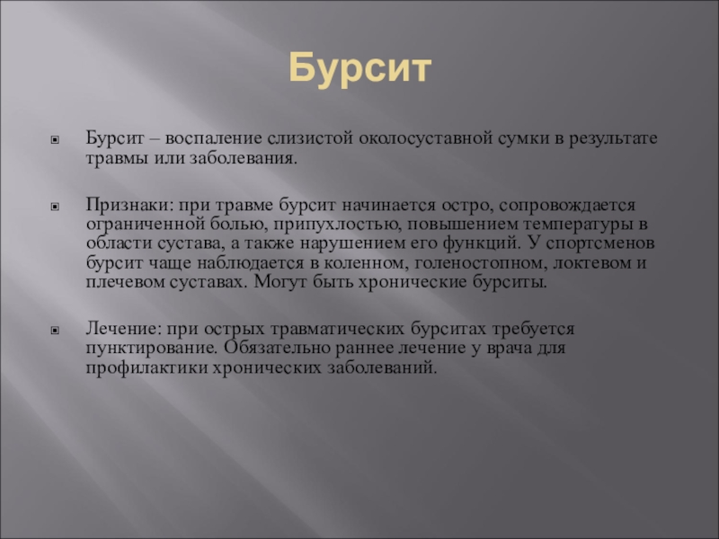 при травме бурсит начинается остро, сопровождается ограниченной болью, припухлостью, повышением температуры в области сустава, а также нарушением его функций. У спортсменов бурсит чаще наблюдается в коленном, голеностопном, локтевом и плечевом суставах. Могут быть хронические бурситы.