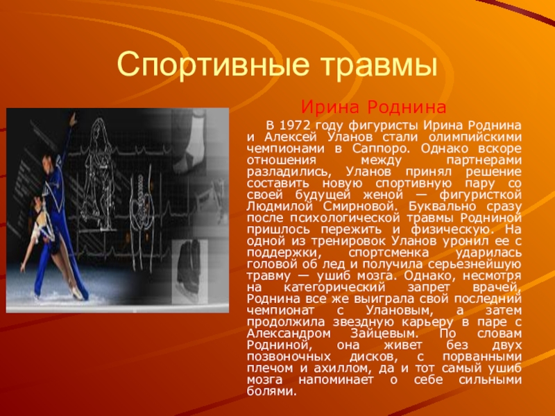 Ирина Роднина и Алексей Уланов стали олимпийскими чемпионами в Саппоро. Однако вскоре отношения между партнерами разладились, Уланов принял решение составить новую спортивную пару со своей будущей женой — фигуристкой Людмилой Смирновой. Буквально сразу после психологической травмы Родниной пришлось пережить и физическую. На одной из тренировок Уланов уронил ее с поддержки, спортсменка ударилась головой об лед и получила серьезнейшую травму — ушиб мозга. Однако, несмотря на категорический запрет врачей, Роднина все же выиграла свой последний чемпионат с Улановым, а затем продолжила звездную карьеру в паре с Александром Зайцевым. По словам Родниной, она живет без двух позвоночных дисков, с порванными плечом и ахиллом, да и тот самый ушиб мозга напоминает о себе сильными болями.