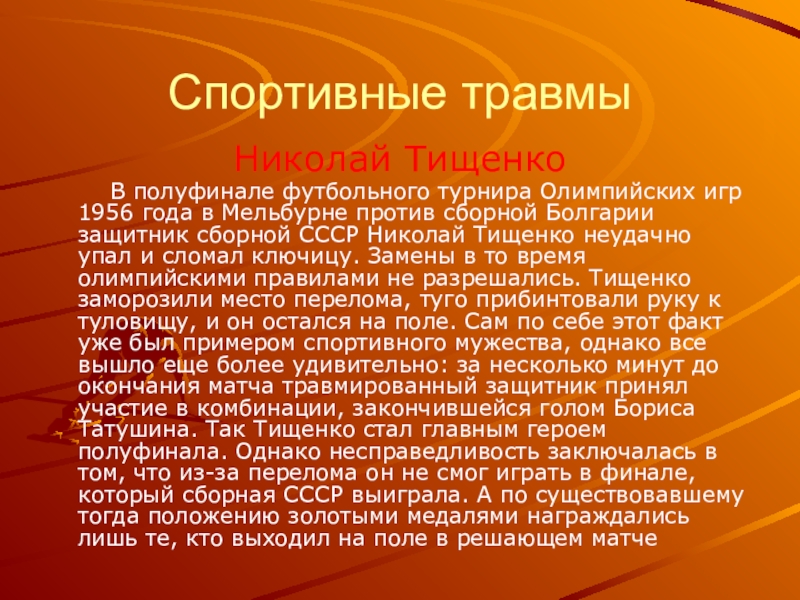 Олимпийских игр 1956 года в Мельбурне против сборной Болгарии защитник сборной СССР Николай Тищенко неудачно упал и сломал ключицу. Замены в то время олимпийскими правилами не разрешались. Тищенко заморозили место перелома, туго прибинтовали руку к туловищу, и он остался на поле. Сам по себе этот факт уже был примером спортивного мужества, однако все вышло еще более удивительно: за несколько минут до окончания матча травмированный защитник принял участие в комбинации, закончившейся голом Бориса Татушина. Так Тищенко стал главным героем полуфинала. Однако несправедливость заключалась в том, что из-за перелома он не смог играть в финале, который сборная СССР выиграла. А по существовавшему тогда положению золотыми медалями награждались лишь те, кто выходил на поле в решающем матче
