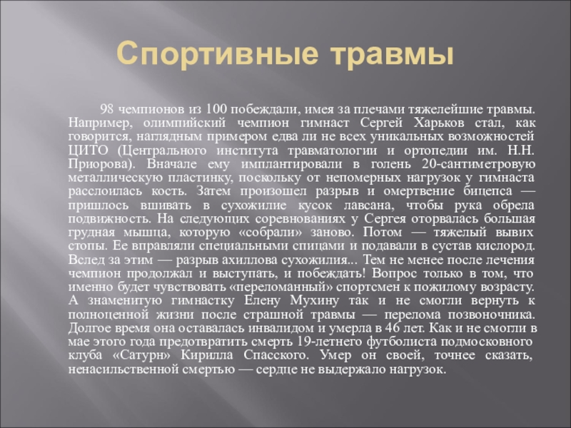 из 100 побеждали, имея за плечами тяжелейшие травмы. Например, олимпийский чемпион гимнаст Сергей Харьков стал, как говорится, наглядным примером едва ли не всех уникальных возможностей ЦИТО (Центрального института травматологии и ортопедии им. Н.Н. Приорова). Вначале ему имплантировали в голень 20-сантиметровую металлическую пластинку, поскольку от непомерных нагрузок у гимнаста расслоилась кость. Затем произошел разрыв и омертвение бицепса — пришлось вшивать в сухожилие кусок лавсана, чтобы рука обрела подвижность. На следующих соревнованиях у Сергея оторвалась большая грудная мышца, которую «собрали» заново. Потом — тяжелый вывих стопы. Ее вправляли специальными спицами и подавали в сустав кислород. Вслед за этим — разрыв ахиллова сухожилия... Тем не менее после лечения чемпион продолжал и выступать, и побеждать! Вопрос только в том, что именно будет чувствовать «переломанный» спортсмен к пожилому возрасту. А знаменитую гимнастку Елену Мухину так и не смогли вернуть к полноценной жизни после страшной травмы — перелома позвоночника. Долгое время она оставалась инвалидом и умерла в 46 лет. Как и не смогли в мае этого года предотвратить смерть 19-летнего футболиста подмосковного клуба «Сатурн» Кирилла Спасского. Умер он своей, точнее сказать, ненасильственной смертью — сердце не выдержало нагрузок.