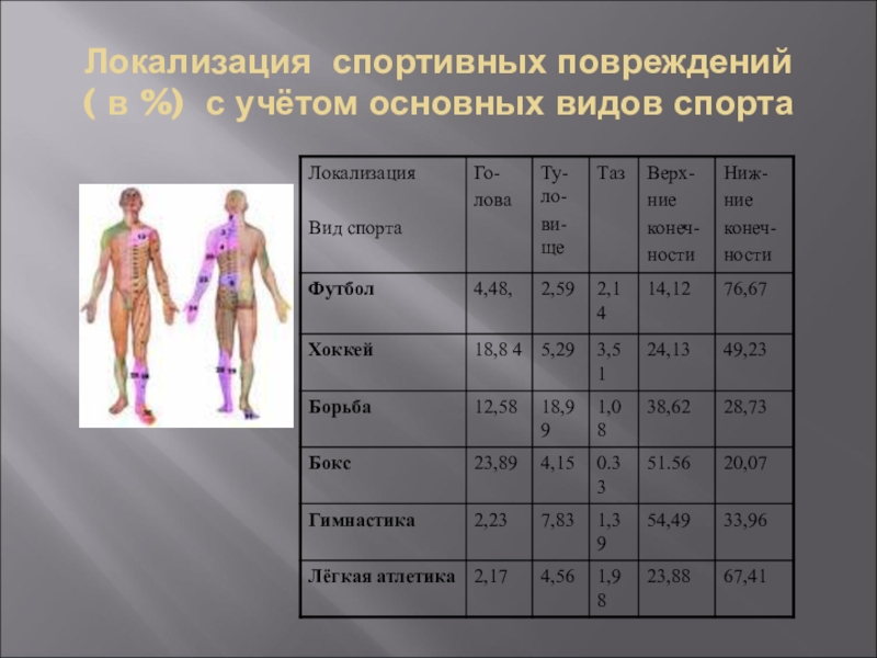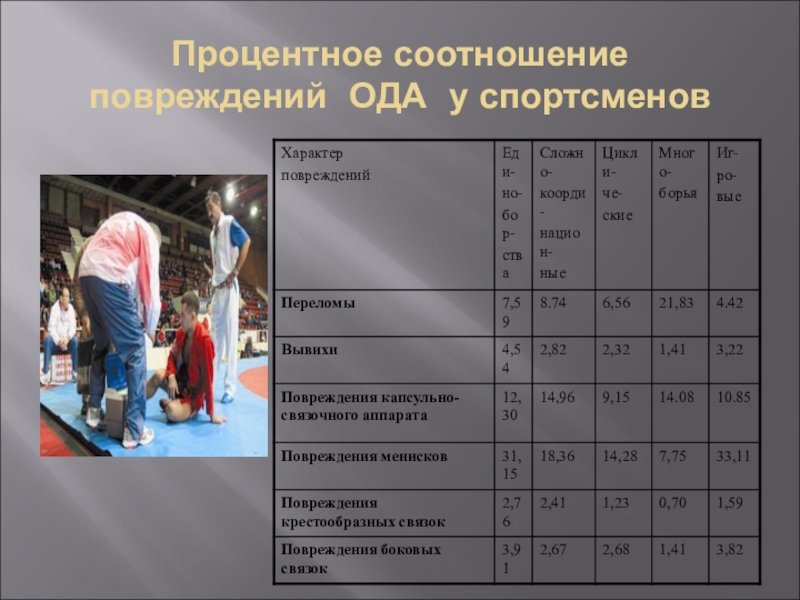 Слайд 10Процентное соотношение повреждений ОДА у спортсменов