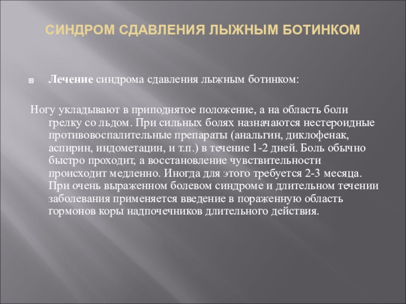 приподнятое положение, а на область боли грелку со льдом. При сильных болях назначаются нестероидные противовоспалительные препараты (анальгин, диклофенак, аспирин, индометацин, и т.п.) в течение 1-2 дней. Боль обычно быстро проходит, а восстановление чувствительности происходит медленно. Иногда для этого требуется 2-3 месяца. При очень выраженном болевом синдроме и длительном течении заболевания применяется введение в пораженную область гормонов коры надпочечников длительного действия.