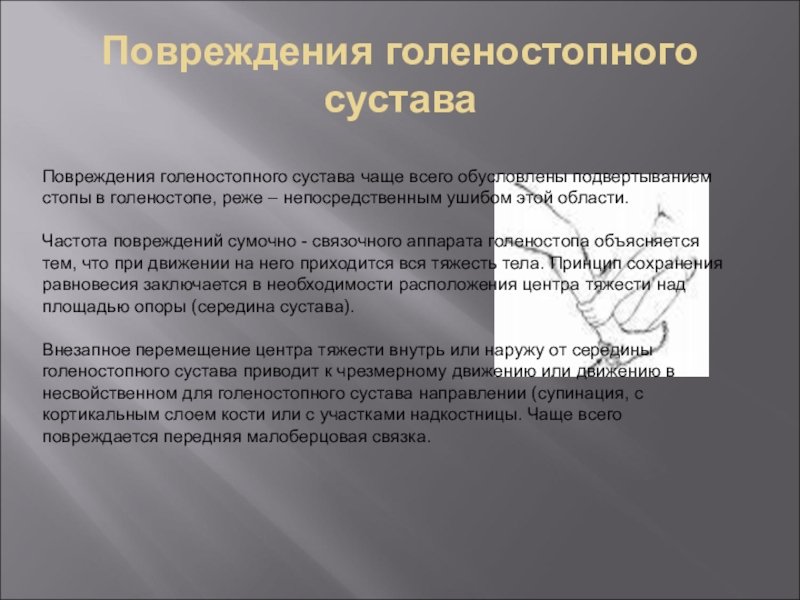 Частота повреждений сумочно - связочного аппарата голеностопа объясняется тем, что при движении на него приходится вся тяжесть тела. Принцип сохранения равновесия заключается в необходимости расположения центра тяжести над площадью опоры (середина сустава).