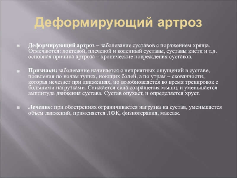 Деформирующий артроз – заболевание суставов с поражением хряща. Отмечаются: локтевой,