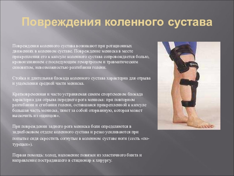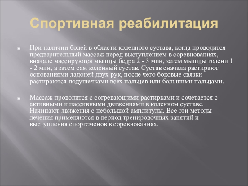 Массаж проводится с согревающими растирками и сочетается с активными и пассивными движениями в коленном суставе. Начинают движения с небольшой амплитуды. Все эти методы лечения применяются в период тренировочных занятий и выступления спортсменов в соревнованиях.