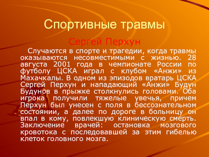 когда травмы оказываются несовместимыми с жизнью. 28 августа 2001 года в чемпионате России по футболу ЦСКА играл с клубом «Анжи» из Махачкалы. В одном из эпизодов вратарь ЦСКА Сергей Перхун и нападающий «Анжи» Будун Будунов в прыжке столкнулись головами. Оба игрока получили тяжелые увечья, причем Перхун был унесен с поля в бессознательном состоянии, а далее по дороге в больницу он впал в кому, повлекшую клиническую смерть. Заключение врачей: остановка мозгового кровотока с последовавшей за этим гибелью клеток головного мозга.