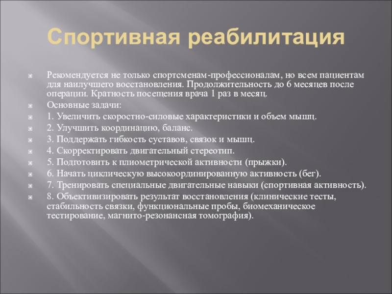 8. Объективизировать результат восстановления (клинические тесты, стабильность связки, функциональные пробы, биомеханическое тестирование, магнито-резонансная томография).