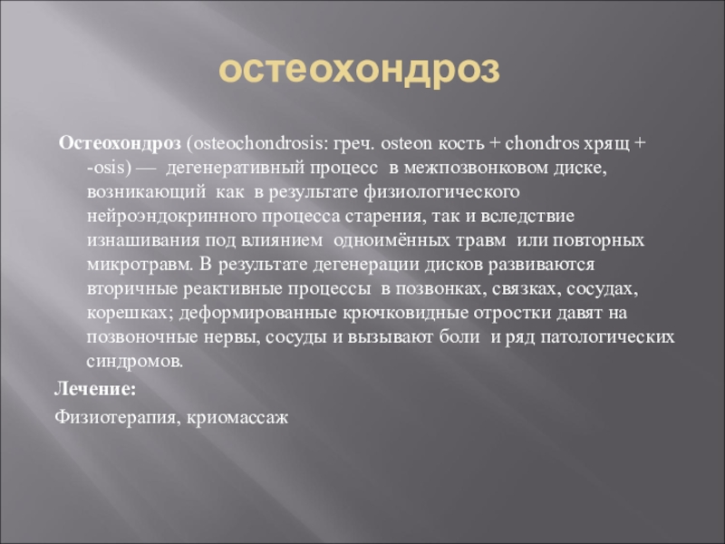 Остеохондроз (osteochondrosis: греч. osteon кость + chondros хрящ + -osis)