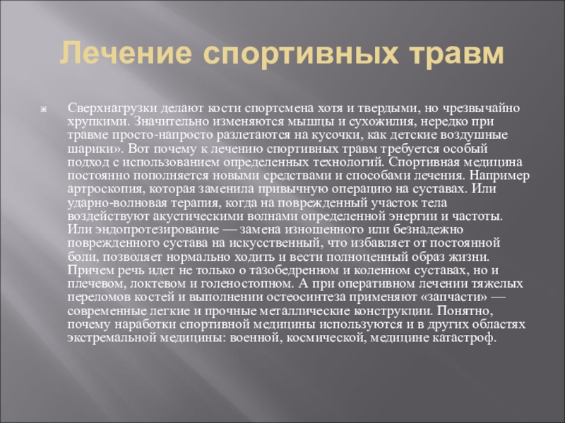 хрупкими. Значительно изменяются мышцы и сухожилия, нередко при травме просто-напросто разлетаются на кусочки, как детские воздушные шарики». Вот почему к лечению спортивных травм требуется особый подход с использованием определенных технологий. Спортивная медицина постоянно пополняется новыми средствами и способами лечения. Например артроскопия, которая заменила привычную операцию на суставах. Или ударно-волновая терапия, когда на поврежденный участок тела воздействуют акустическими волнами определенной энергии и частоты. Или эндопротезирование — замена изношенного или безнадежно поврежденного сустава на искусственный, что избавляет от постоянной боли, позволяет нормально ходить и вести полноценный образ жизни. Причем речь идет не только о тазобедренном и коленном суставах, но и плечевом, локтевом и голеностопном. А при оперативном лечении тяжелых переломов костей и выполнении остеосинтеза применяют «запчасти» — современные легкие и прочные металлические конструкции. Понятно, почему наработки спортивной медицины используются и в других областях экстремальной медицины: военной, космической, медицине катастроф.