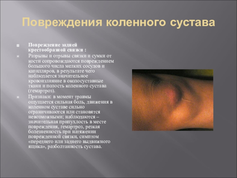 сопровождающееся разрывом сумки. Возможны повреждения околосуставных мягких тканей сосудов.