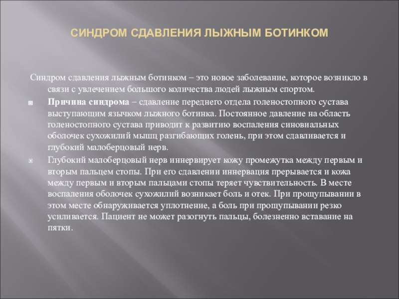 Причина синдрома – сдавление переднего отдела голеностопного сустава выступающим язычком лыжного ботинка. Постоянное давление на область голеностопного сустава приводит к развитию воспаления синовиальных оболочек сухожилий мышц разгибающих голень, при этом сдавливается и глубокий малоберцовый нерв.