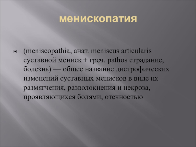 — общее название дистрофических изменений суставных менисков в виде их размягчения, разволокнения и некроза, проявляющихся болями, отечностью