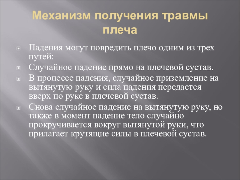 В процессе падения, случайное приземление на вытянутую руку и сила падения передается вверх по руке в плечевой сустав.
