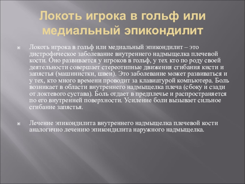 медиальный эпикондилит – это дистрофическое заболевание внутреннего надмыщелка плечевой кости. Оно развивается у игроков в гольф, у тех кто по роду своей деятельности совершает стереотипные движения сгибания кисти и запястья (машинистки, швеи). Это заболевание может развиваться и у тех, кто много времени проводит за клавиатурой компьютера. Боль возникает в области внутреннего надмыщелка плеча (сбоку и сзади от локтевого сустава). Боль отдает в предплечье и распространяется по его внутренней поверхности. Усиление боли вызывает сильное сгибание запястья.