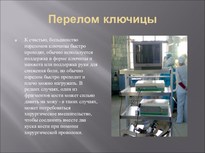 в форме ключицы и манжета или поддержка руки для снижения боли, но обычно перелом быстро проходит и плечо можно нагружать. В редких случаях, один из фрагментов кости может сильно давить на хожу - в таких случаях, может потребоваться хирургическое вмешательство, чтобы соединить вместе два куска кости при помощи хирургической проволоки.