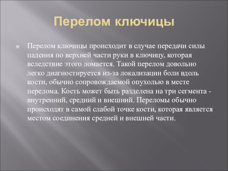 части руки в ключицу, которая вследствие этого ломается. Такой перелом довольно легко диагностируется из-за локализации боли вдоль кости, обычно сопровождаемой опухолью в месте перелома. Кость может быть разделена на три сегмента - внутренний, средний и внешний. Переломы обычно происходят в самой слабой точке кости, которая является местом соединения средней и внешней части.