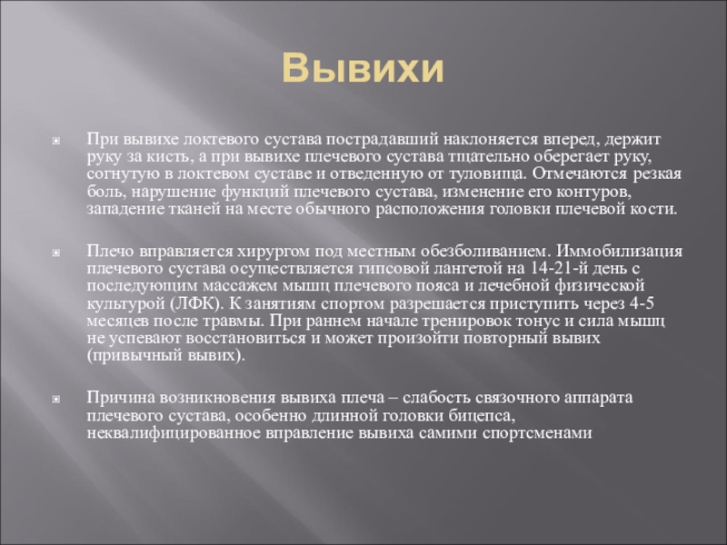 а при вывихе плечевого сустава тщательно оберегает руку, согнутую в локтевом суставе и отведенную от туловища. Отмечаются резкая боль, нарушение функций плечевого сустава, изменение его контуров, западение тканей на месте обычного расположения головки плечевой кости.