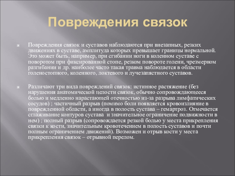 Различают три вида повреждений связок: истинное растяжение (без нарушения анатомической целости связок, обычно сопровождающееся болью и медленно нарастающей отечностью из-за разрыва лимфатических сосудов) ; частичный разрыв (помимо боли появляется кровоизлияние в поврежденной области, а иногда в полость сустава – гемартроз. Отмечается сглаживание контуров сустава и значительное ограничение подвижности в нем) ; полный разрыв (сопровождается резкой болью у места прикрепления связки к кости, значительным кровотечением в полость суставов и почти полным ограничением движений). Возможен и отрыв кости у места прикрепления связок – отрывной перелом.