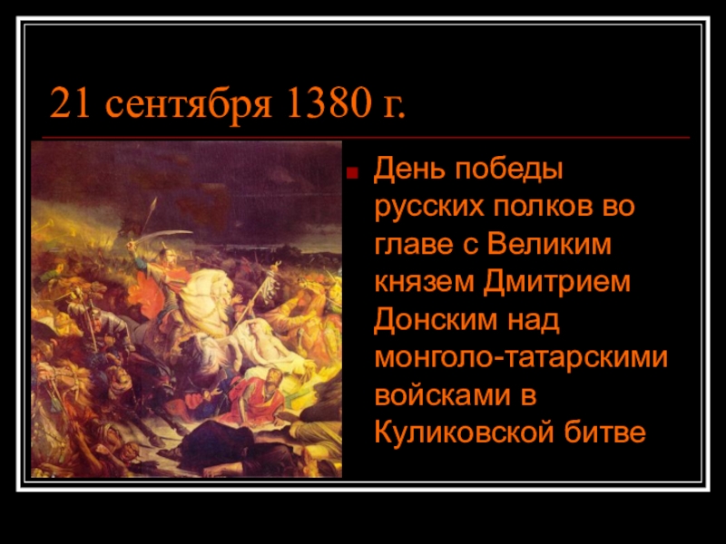 21 сентября 1380 г.День победы русских полков во главе с Великим князем Дмитрием Донским над монголо-татарскими войсками