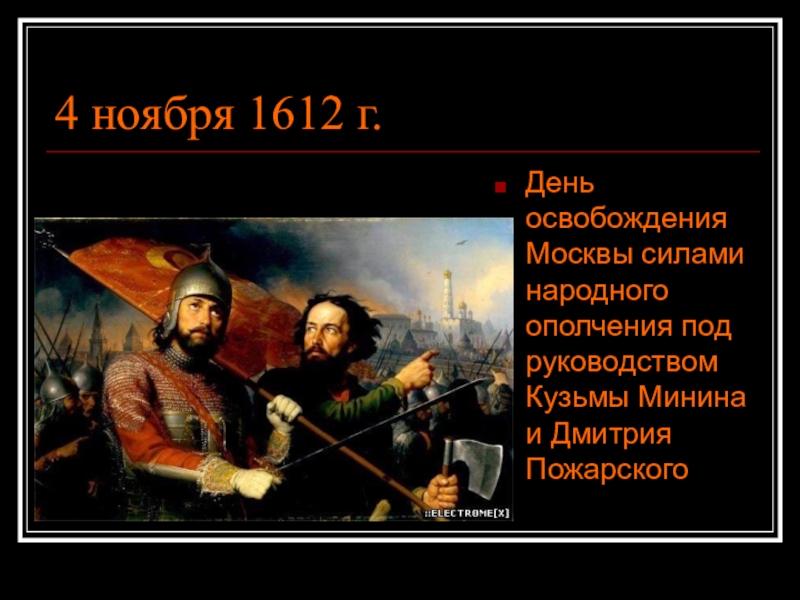 4 ноября 1612 г.День освобождения Москвы силами народного ополчения под руководством Кузьмы Минина и Дмитрия Пожарского