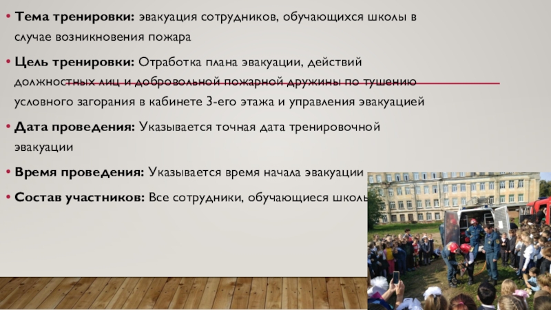 Дата проведения: Указывается точная дата тренировочной эвакуации