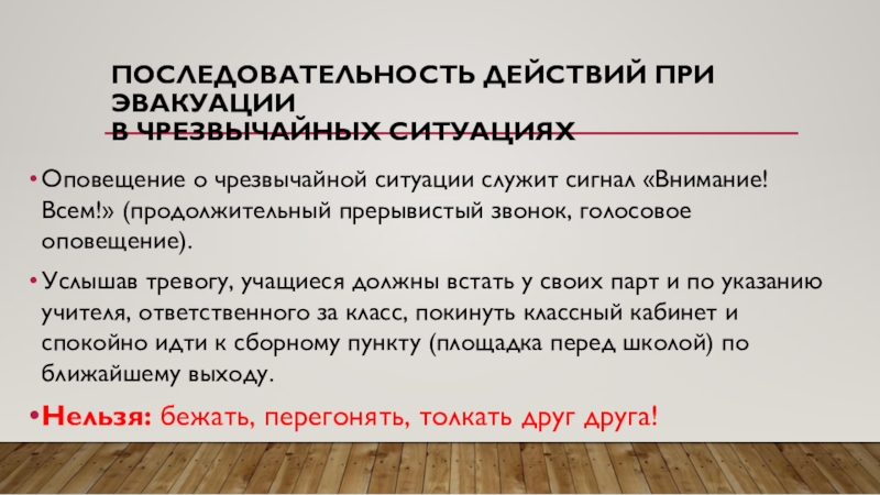 Последовательность действий при эвакуации в чрезвычайных ситуациях Оповещение о чрезвычайной ситуации служит сигнал «Внимание! Всем!» (продолжительный прерывистый