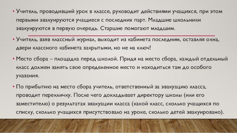 Учитель, проводивший урок в классе, руководит действиями учащихся, при этом первыми эвакуируются учащиеся с последних парт. Младшие