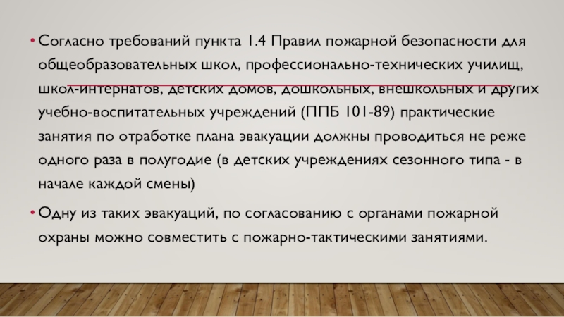 Согласно требований пункта 1.4 Правил пожарной безопасности для общеобразовательных школ, профессионально-технических училищ, школ-интернатов, детских домов, дошкольных, внешкольных и других учебно-воспитательных учреждений (ППБ 101-89) практические занятия по отработке плана эвакуации должны проводиться не реже одного раза в