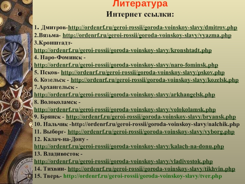 Основанный в 1860 г. как военный пост, стал форпостом России на Дальнем Востоке. Владивосток стал крупным портом. В русско-японскую войну отсюда уходил на действия против коммуникаций врага Владивостокский отряд крейсеров, успешно нарушавший торговые коммуникации японцев, в Первую мировую войну стал одним из стратегических портов для связей с союзниками по Антанте. С освобождением Владивостока в 1922 г. закончилась гражданская война на Дальнем Востоке. В страшные годы ВОВ город стал настоящим портом-крепостью, заслонившим Советский Союз от могучего флота Японии, союзницы немцев. Именно Владивосток взял на себя роль «цеха» , снабжавшего страну продукцией для фронта, кадрами. 2 сентября 2012г. состоялось торжественное открытие стелы «Город воинской славы».