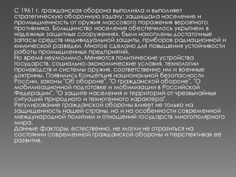 Слайд 11С 1961 г. гражданская оборона выполняла и выполняет стратегическую оборонную задачу: